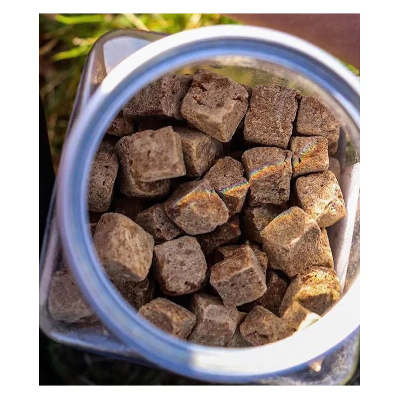 Smaczki są liofilizowane, co oznacza, że zostały wysuszone mrozem, a to pozwoliło na usunięcie z nich wody.